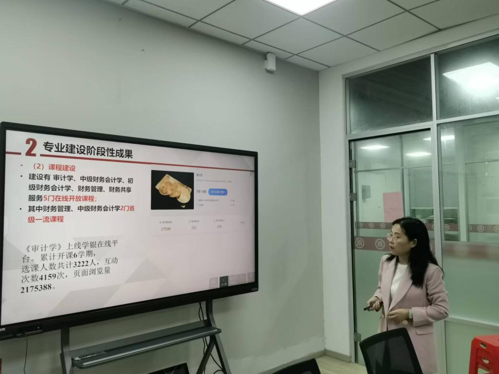 审计学省级一流本科专业汇报人张丽副教授从专业建设概况、专业建设成果、专业建设不足及未来建设展望三个方面进行汇报。