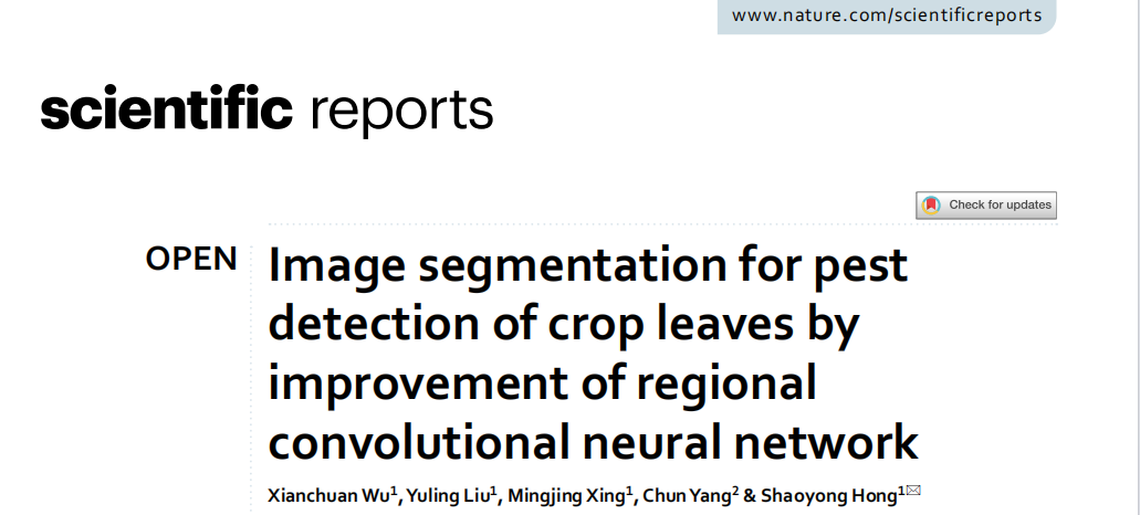在现代农业生产中,病虫害的早期检测对于保障作物健康和提高产量至关重要。近日,威廉希尔洪绍勇副教授领导的研究团队在《Scientific Reports》期刊上发表了一项突破性研究成果,论文的第一作者为吴宪传老师。该论文题为“Image segmentation for pest detection of crop leaves by improvement of regional convolutional neural network”,该期刊属于SCIE检索期刊,是JCR Q1分区,中科院二区。