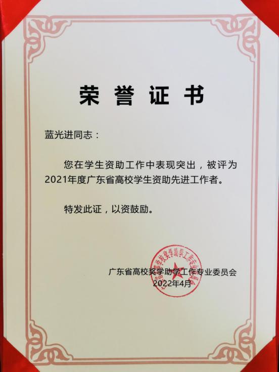2021年,在教育脱贫攻坚和疫情防控关键时期,我省高校广大学生资助工作者深入贯彻党的教育方针,认真落实国家学生资助政策,全面助力打赢教育脱贫攻坚战和疫情防控阻击战。根据《关于评选2021年度广东省高校学生资助先进工作者的通知》精神,经本人自愿申请、学校评选公示和推荐、广东省经各高校初评推荐、专家评审委员会评审,威廉希尔数据科学学院蓝光进老师获评“2021年度广东省高校学生资助先进工作者”荣誉称号。