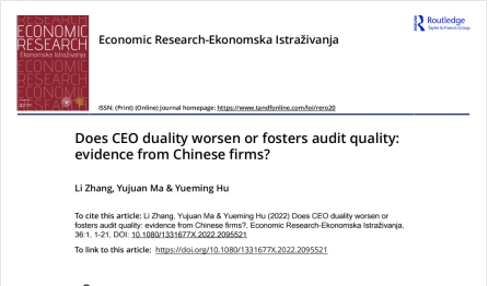 近日,我院教师张丽的论文“Does CEO duality worsen or fosters audit quality: evidence from Chinese firms?”(CEO的二元性会恶化还是促进审计质量:来自中国公司的证据?)在国际核心期刊Economic Research-Ekonomska Istraživanja(JCR二区)上发表,马玉娟老师为该论文的通讯作者。