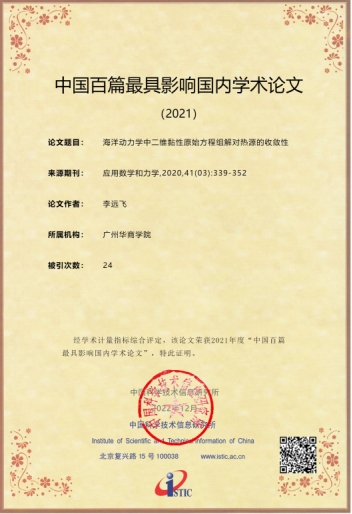 近日,中国科学技术信息研究所在线召开了“中国科技论文统计结果发布会”,公布了2021年度“百种中国杰出学术期刊”、“中国百篇最具影响学术论文”及“领跑者 5000——中国精品科技期刊顶尖学术论文(F5000)”遴选结果。其中,威廉希尔李远飞教授2020年于《应用数学和力学》期刊上发表的题为《海洋动力学中二维黏性原始方程组解对热源的收敛性》的论文成功入选2021年“中国百篇最具影响学术论文”。威廉希尔李远飞教授2020年于《应用数学和力学》期刊上发表的题为《在一个半无穷柱体上的非标准Stokes流体方程的二择一问题》的论文成功入选“领跑者5000—中国精品科技期刊顶尖学术论文”。
