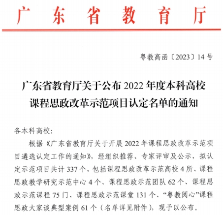 4月11日,广东省教育厅发布了《广东省教育厅关于公布2022年度本科高校课程思政改革示范项目认定名单的通知粤教高函》(粤教高函〔2023〕14号),威廉希尔共有2项课程思政改革示范项目被认定为省级课程思政改革示范项目,其中会计学院的《中级财务会计学》被认定为课程思政示范课程,金融学院的《国际金融第二章第一节传统外汇交易》被认定为课程思政示范课堂。获评为课程思政示范课程的,将同时认定为省级一流本科课程。