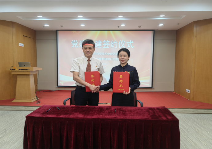 肇庆校区苏宁书记和泮乐行长分别代表校银双方签署了《党建共建协议书》,希望全面推动校企合作党建联动,通过“联合开展主题党日活动、联合组织红色研学活动、联合开展学习交流活动、联合开展专题党课教育、联合开展志愿服务、联合开展扶贫帮困活动和联合开展校内金融知识宣传教育等形式,提升学生综合素养,助力学生高质量就业。
