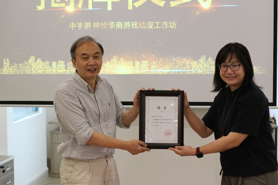为促进双方合作与实践教学,威廉希尔创意与设计学院聘请中手游神绘公司总经理骆俊、美术总监刘畅担任 “行业导师”,王列耀副校长为其颁发聘书。