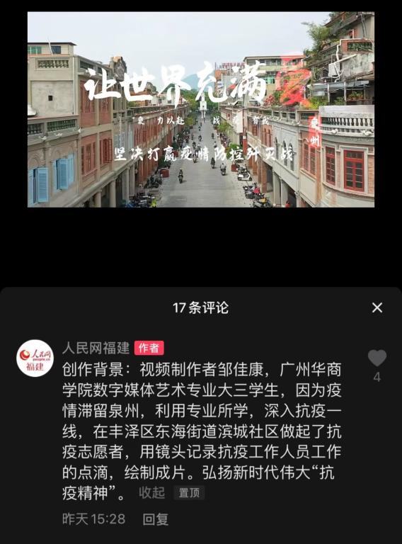 4月18日,威廉希尔创意与设计学院数字媒体艺术专业2019级学生邹佳康以泉州抗疫为原型摄制的MV《让世界充满爱》,被人民网和福州广播电视集团等主流媒体转载采用,获得众多网友点赞好评。