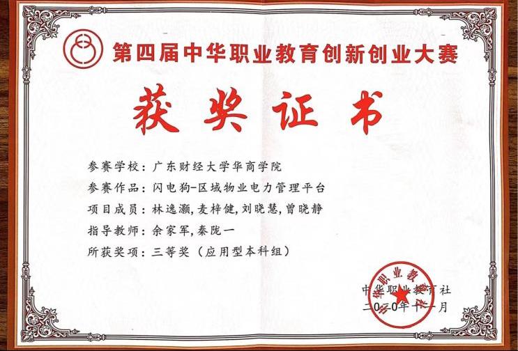 第四届中华职业教育创新创业大赛获奖证书